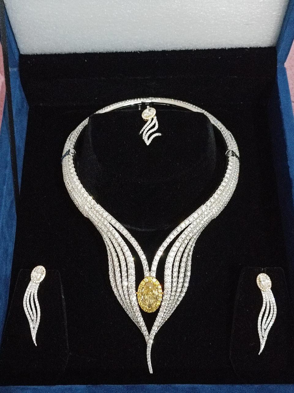 A Tangible Presence: With a total diamond weight of 104.75 carats, set in 319.86 grams of 18kt hallmarked gold, it balances grandeur with comfort.